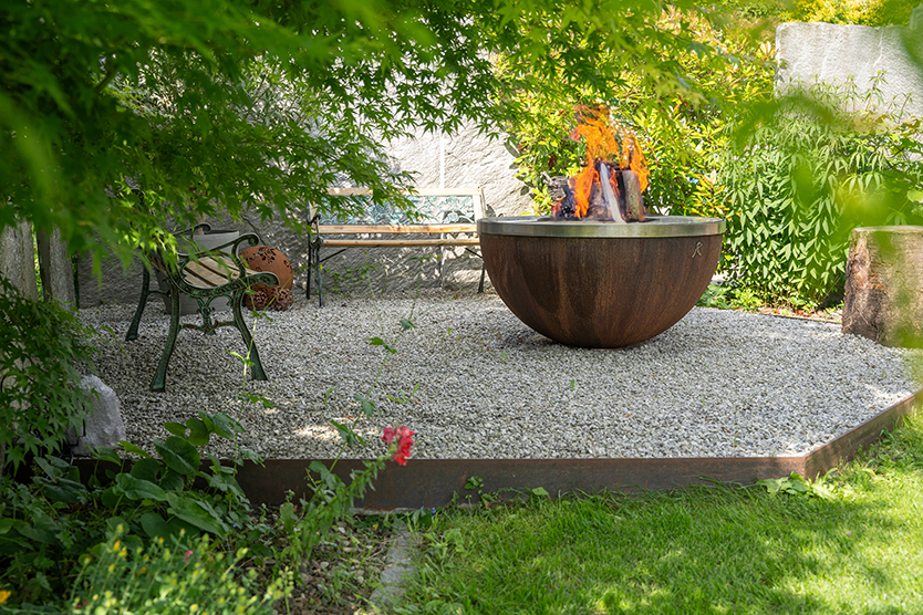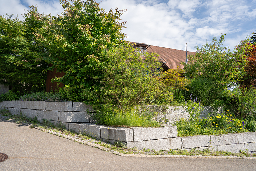 Bei der kompletten Neugestaltung dieser Gartenanlage haben wir einen besonderen Fokus auf Qualität und Ästhetik gelegt. Der erhöhte Grillplatz, eingefasst mit eleganten Stahlblechen und einem Belag aus Tessinersplitt, bildet das Zentrum für gesellige Stunden. Eine Feuerschale aus Stahl sorgt für gemütliche Atmosphäre. Für Privatsphäre entlang der Strasse haben wir einen Sichtschutz aus Granitkrustenplatten aus dem Tessin geschaffen, der gleichzeitig robust und stilvoll ist.