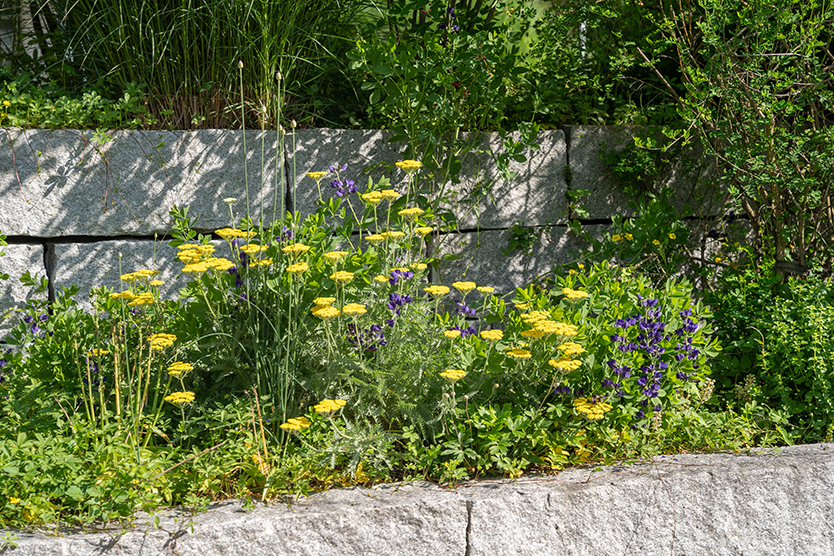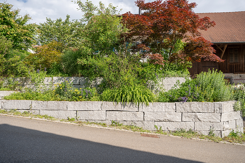 Der Rasen wurde komplett überarbeitet und eine Terrassierung mit Granitquadersteinen angelegt, die das Gelände strukturiert und zugänglich macht. Die neue Bepflanzung mit Gehölzen, Stauden, Gräsern und Zwiebelgewächsen verleiht dem Garten Farbe und Vielfalt zu jeder Jahreszeit. Eine Betonmauerverkleidung aus Fichtenholz bringt Natürlichkeit und Wärme ins Gesamtbild.