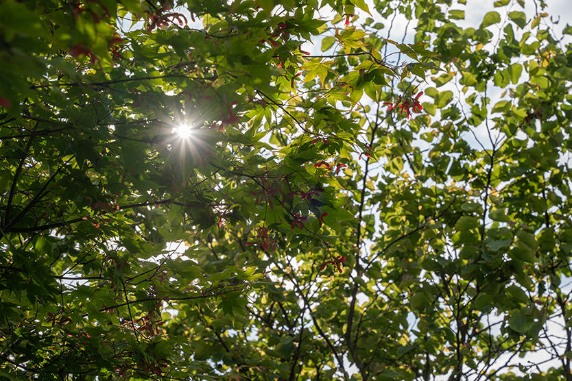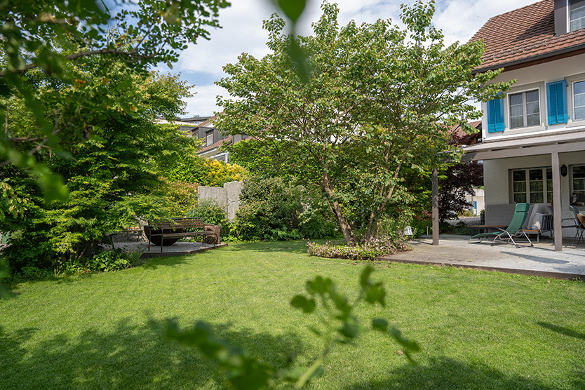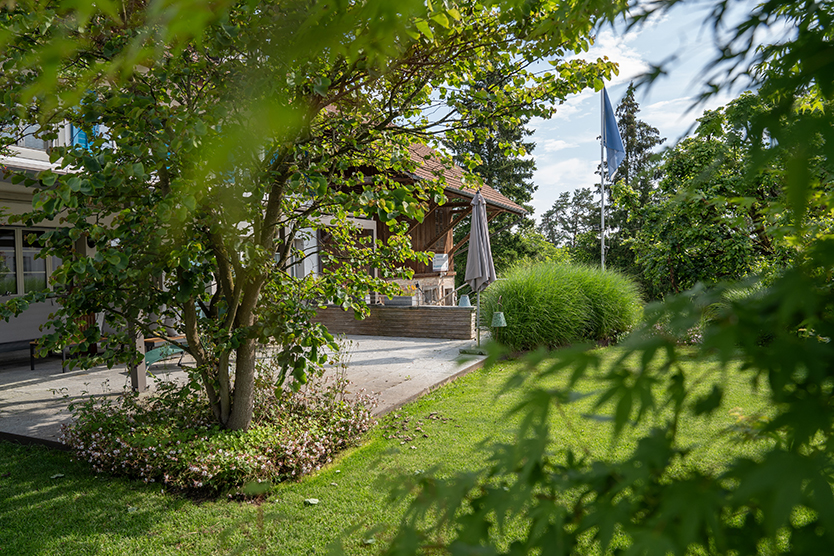 Der Sitzplatz mit Granitplatten aus dem Tessin bietet einen eleganten Rückzugsort, in den sich der wunderschöne Judasbaum perfekt einfügt. Seine leuchtend violetten Blüten setzen einen besonderen Akzent und bereichern das Ambiente zusätzlich. Durch geschickt platzierte Gehölze wurden bewusst verschiedene Räume im Garten geschaffen, die zum Entdecken und Verweilen einladen.