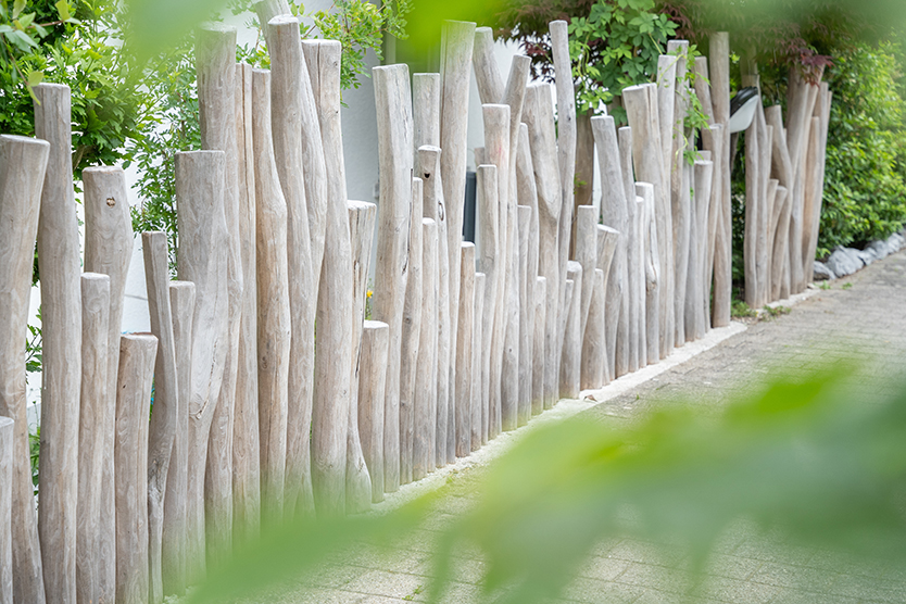 Die in die Jahre gekommene Eichenholzschwellenmauer musste abgebrochen werden. Da der Garten mitten in einem Wohnquartier liegt und ringsum ein Gehweg verläuft, war ein Sichtschutz für etwas Privatsphäre unerlässlich. Diesen haben wir mit rohen Robinienstämmen realisiert, die durch ihre Unregelmäßigkeit eine spielerische Note mit sich bringen.