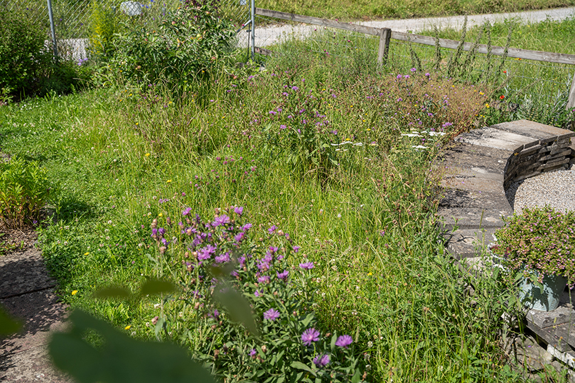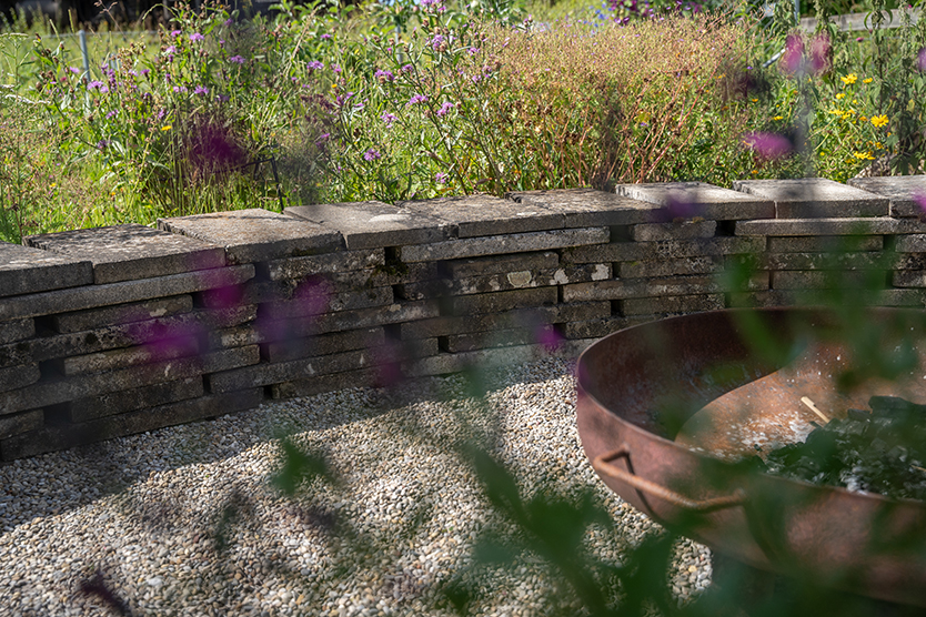 Die Kundschaft übernahm den bestehenden Schrebergarten und veranlasste eine umfassende Neugestaltung. Die ursprünglich zu grossen Betonplattenflächen wurden reduziert, um Platz für eine vielfältige Bepflanzung zu schaffen. Die Betonplatten fanden eine neue Verwendung als Sitzmauer, die den gemütlichen Kiesplatz mit Feuerschale umgibt. Ein Teil der Gemüsebeete wurde zugunsten einer blühenden Blumenwiese umgestaltet, die nun mit ihrer Farbenpracht und Artenvielfalt begeistert. Eine Ruderalfläche mit heimischen Pflanzen rundet die ökologische Aufwertung ab und bietet Lebensraum für zahlreiche Tierarten.