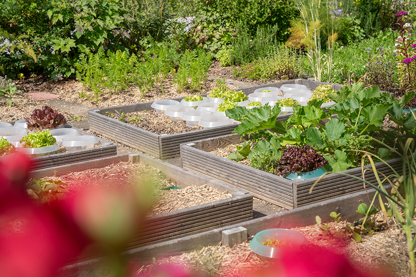 Die neu angelegten Gemüsebeete wurden sorgfältig mit naturbelassenen Lärchenbrettern eingefasst, die nicht nur funktional sind, sondern auch zum rustikalen Charme des Gartens beitragen. Um nachhaltig mit Ressourcen umzugehen, wird das Regenwasser vom Dach des Gartenhäuschens gesammelt und in einer Regenwassertonne aufgefangen, das dann für die Bewässerung der Pflanzen genutzt wird.