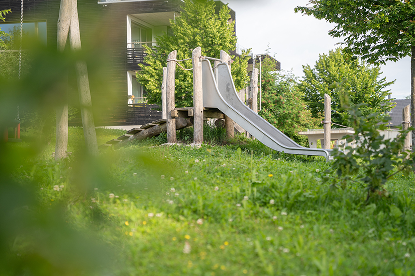 Der Spielplatz aus rohen Robinienstämmen bietet zudem den Kindern einen naturnahen und spannenden Ort zum Spielen und Entdecken.