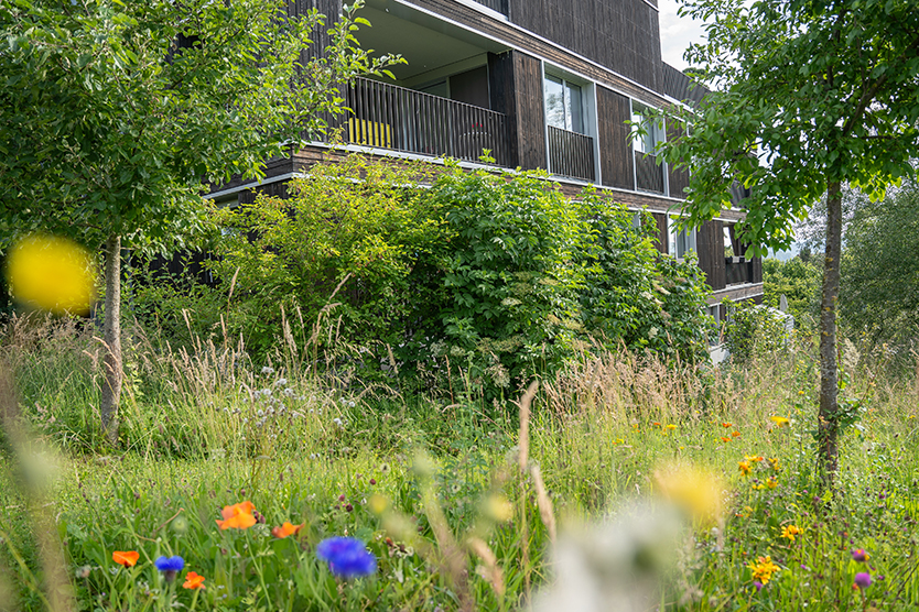 Diese naturnahe Überbauung mit zwei Mehrfamilienhäusern besticht durch eine schlichte, naturnahe Ästhetik. Die Blumenwiese zwischen den Gebäuden, aufgelockert mit ein paar Gehölzgruppen, ist pflegeextensiv und bietet einen enormen Mehrwert für die Artenvielfalt. Üppige Sträucher wie Holunder, Felsenbirnen und Feigen bieten nicht nur an ausgewählten Stellen mehr Privatsphäre, sondern können auch für die Zubereitung verschiedener Köstlichkeiten genutzt werden. Unter den Gehölzen sorgen zahlreiche Blütenstauden für farbenfrohe Akzente und erfreuen das Auge.