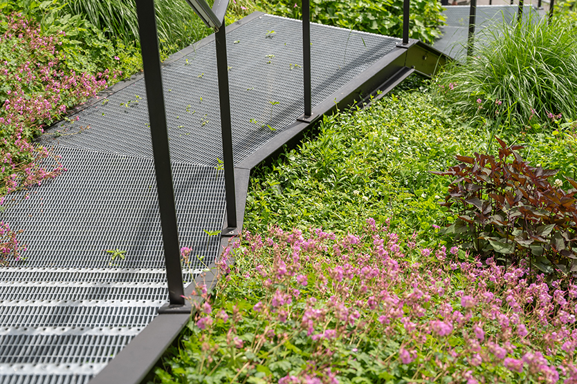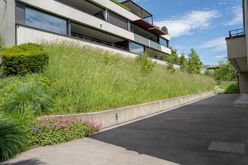Die beiden Mehrfamilienhäuser hoch über dem Zürichsee bieten einen wunderbaren Ausblick in die Ferne und auf die Alpen. Die Umgebung ist geprägt von einer Blumenwiese mit zahlreichen heimischen Gehölzen. Die Stahltreppe, die die Häuser verbindet, ist von diversen Blütenstauden umgeben. Diese südexponierte Fläche lockt zahlreiche Lebewesen an, darunter auch viele Mauereidechsen.