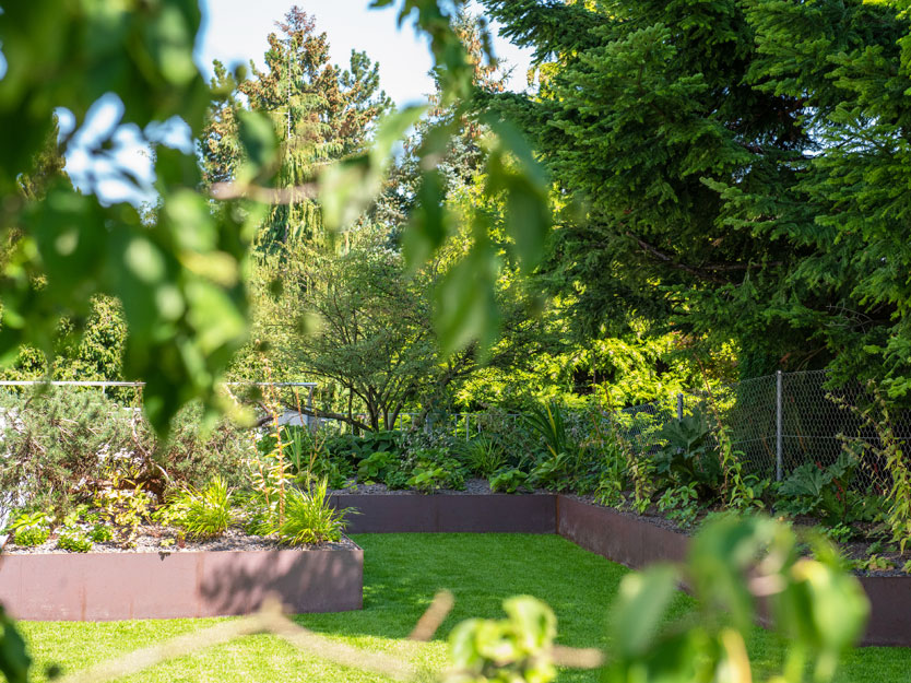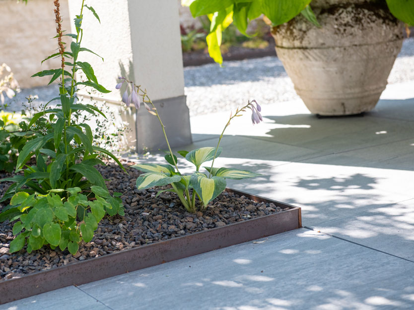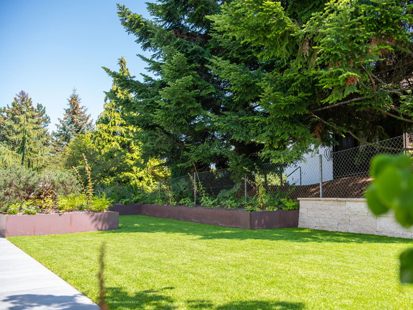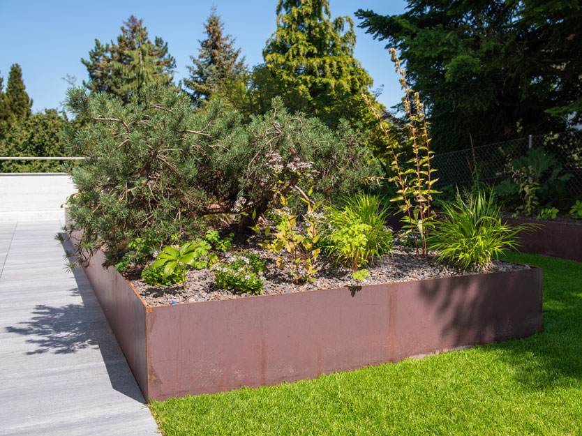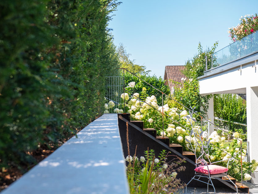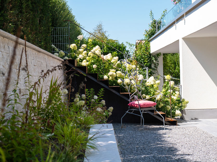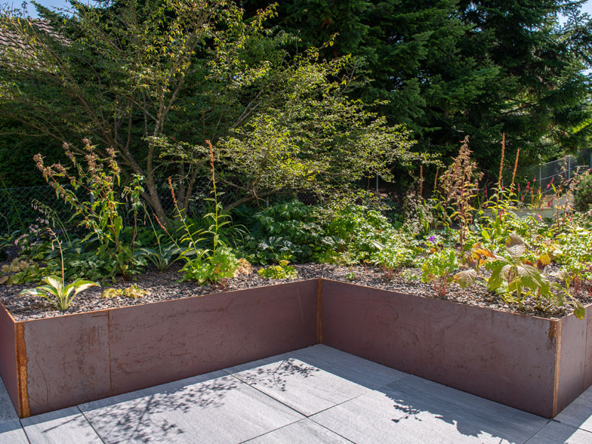 Im vorderen Bereich des Gartens war aufgrund der darunterliegenden Garage zu wenig Bodenaufbau für eine herkömmliche Bepflanzung vorhanden. Um diesem Problem zu begegnen, errichteten wir ein etwa 50 cm hohes Stahlbeet, das mit einer Vielzahl heimischer Stauden bepflanzt wurde. Die auf Mass gefertigte Stahltreppe fügt sich nahtlos in das Design ein und bietet eine elegante Verbindung zum hinter der Eibenhecke liegenden Fussweg. So entstand ein Garten, der nicht nur funktional, sondern auch ästhetisch ansprechend ist und zum Verweilen einlädt.