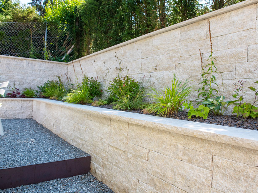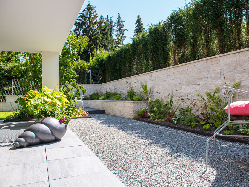Als wir den Auftrag für diese Neugestaltung erhielten, stiessen wir auf Schotterflächen und eine lieblos gestaltete Böschung. Die Böschung wurde sorgfältig abgetragen und durch eine Natursteinmauer aus kroatischem Kalkstein ersetzt. Um die 2,20 Meter hohe Mauer nicht erdrückend wirken zu lassen, haben wir sie abgetreppt und die Abstufungen mit zahlreichen Blütenstauden bepflanzt, was dem Garten eine lebendige und farbenfrohe Note verleiht.