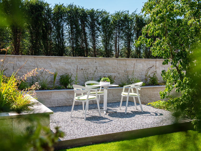 Der Kiesplatz wurde leicht erhöht angelegt, um spannende visuelle Akzente zu setzen. Entlang des oberhalb der Mauer verlaufenden Weges pflanzten wir eine dichte Eibenhecke, die als effektiver Sichtschutz dient. Ein geschickt platzierter, grosser Hartriegel sorgt für eine gemütliche Raumwirkung und schafft einen harmonischen Übergang.